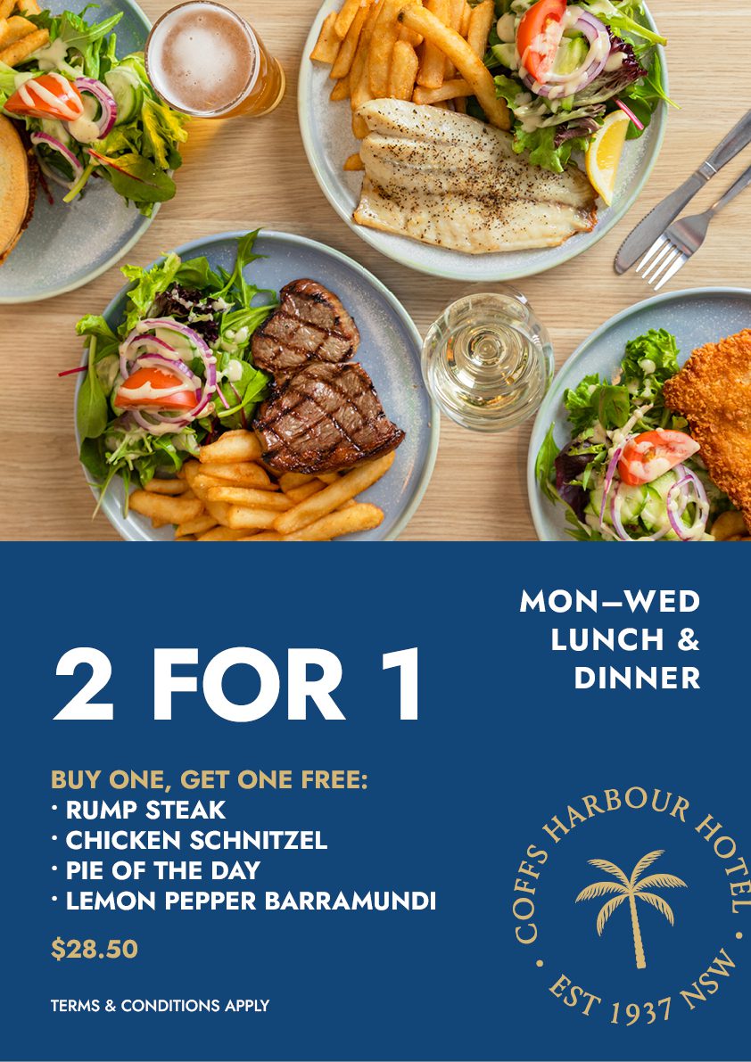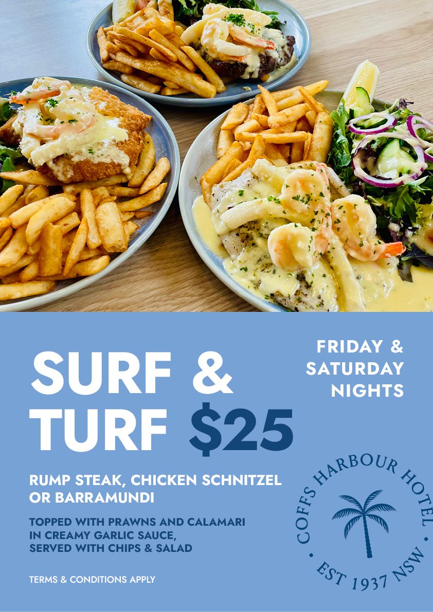 Experience the perfect blend of classic pub meals and coastal favourites at The Coffs Hotel’s Bistro. Whether you’re gathering with friends, celebrating milestones with family, or catching all the live sporting action, we’ve got you covered.